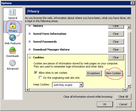 Click ‘Privacy’ then ‘View Cookies’ — you should get another box popping up