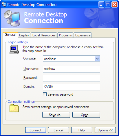 Run the RDS client (Accessories->Communications->Remote Desktop Connection), and expand the options. Set all the options as you would normally, but ensure the host name is ‘localhost’: