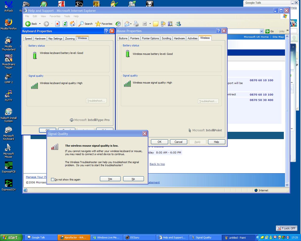 Unless you like seeing things like this. It’s driving me mad! I’m still on the phone to MS technical suport after my shiny new Microsoft Wireless Desktop 6000 fails to recognise about every one in 100 keypresses, and keeps poppin up stupid error messages like the ones in the link — which for the lazy is a dialog box telling me the wireless strength is low…even though the Control Panel tells me it’s 100%. The receiever is literally 2 inches from the keyboard — signal strength isn’t an issue, even though I’ve succesfully typed from two rooms away. I’ve followed every step of the FAQ and still repeated keypresses seem lost and some other keys just missed entirely. Bonkers. If this doesn’t sort it I’m back to PC World to get me one with wires.