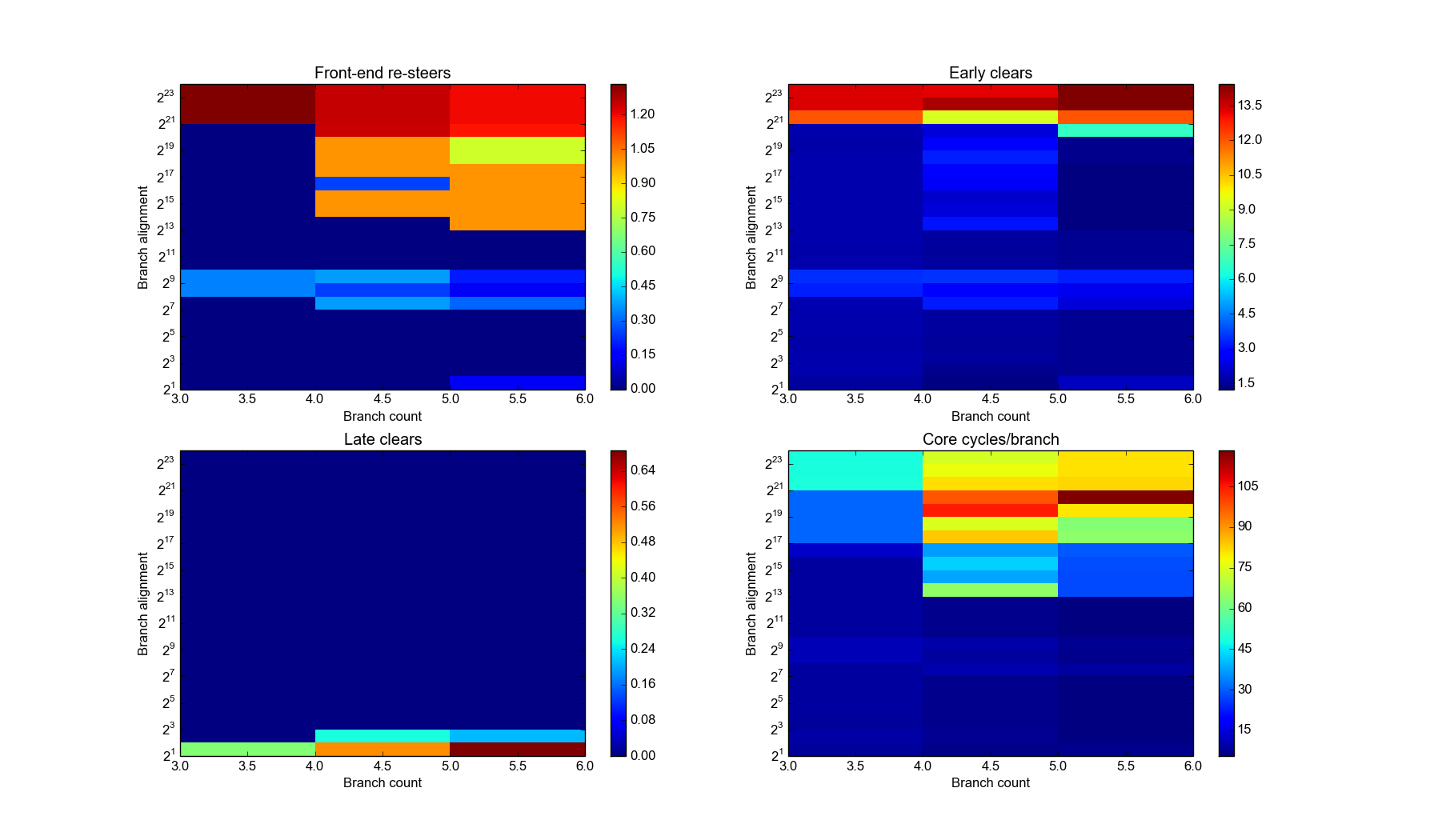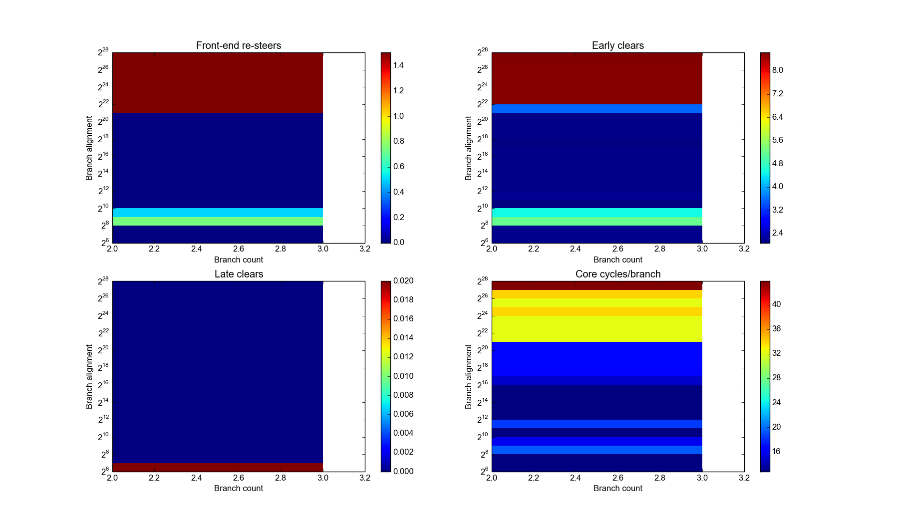 Worth noting is that all these studies have been done with logical memory addresses, and only within a “sensible” amount of RAM – not taxing the higher bits of the 64-bit address space. The initial branch is aligned to a 4MB boundary. There could be yet physical memory issues to consider: I’d expect the BPU to work purely in logical addreeses though.