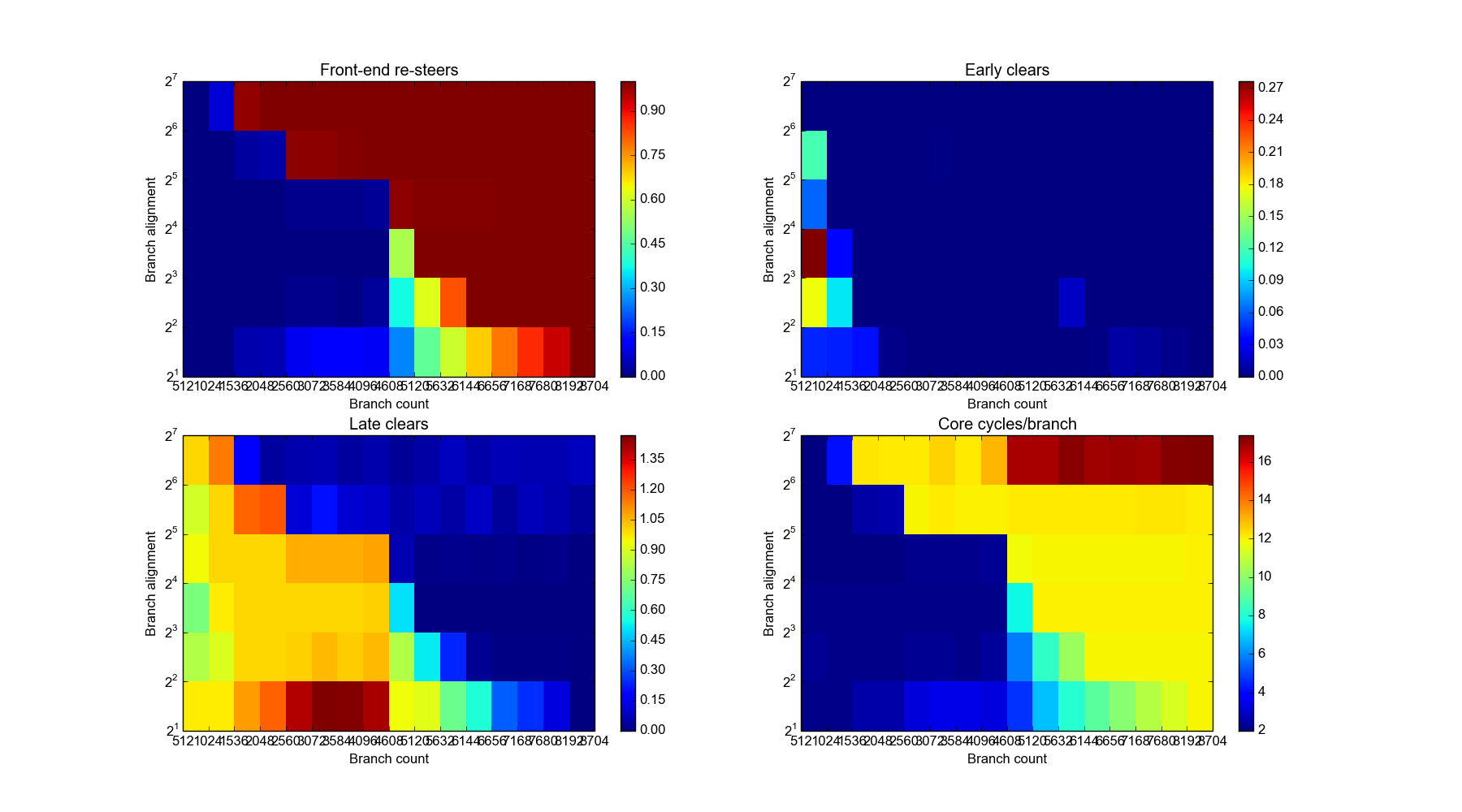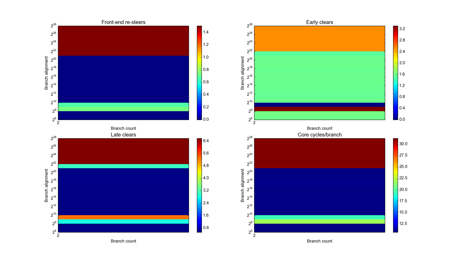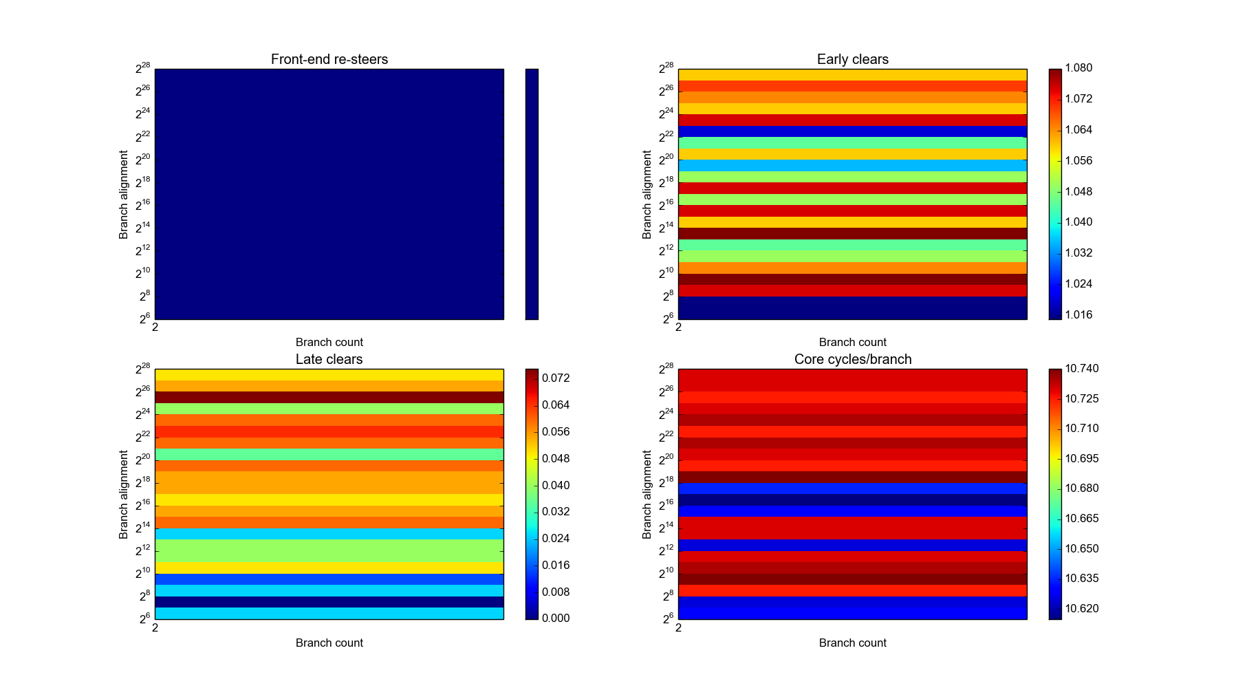 It’s a whole other picture for Haswell: no discernable resteers at all! Just the 20% resteers at 5 branches we’d expect given the seemingly improved eviction setup.
