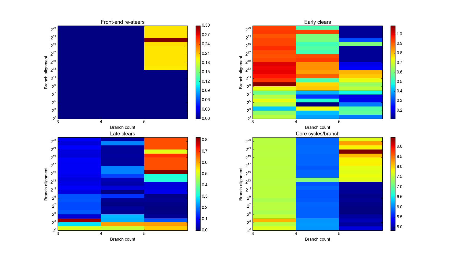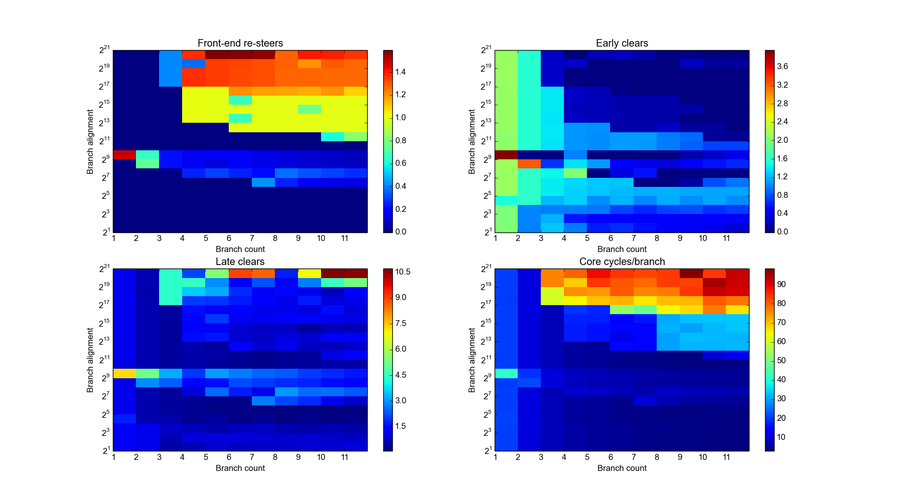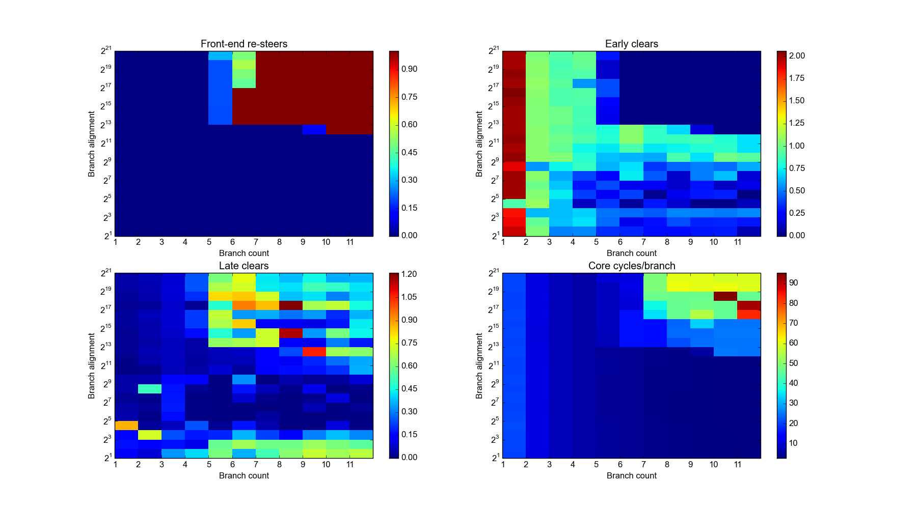 It’s a whole other picture for Haswell: no discernable resteers at all! Just the 20% resteers at 5 branches we’d expect given the seemingly improved eviction setup.