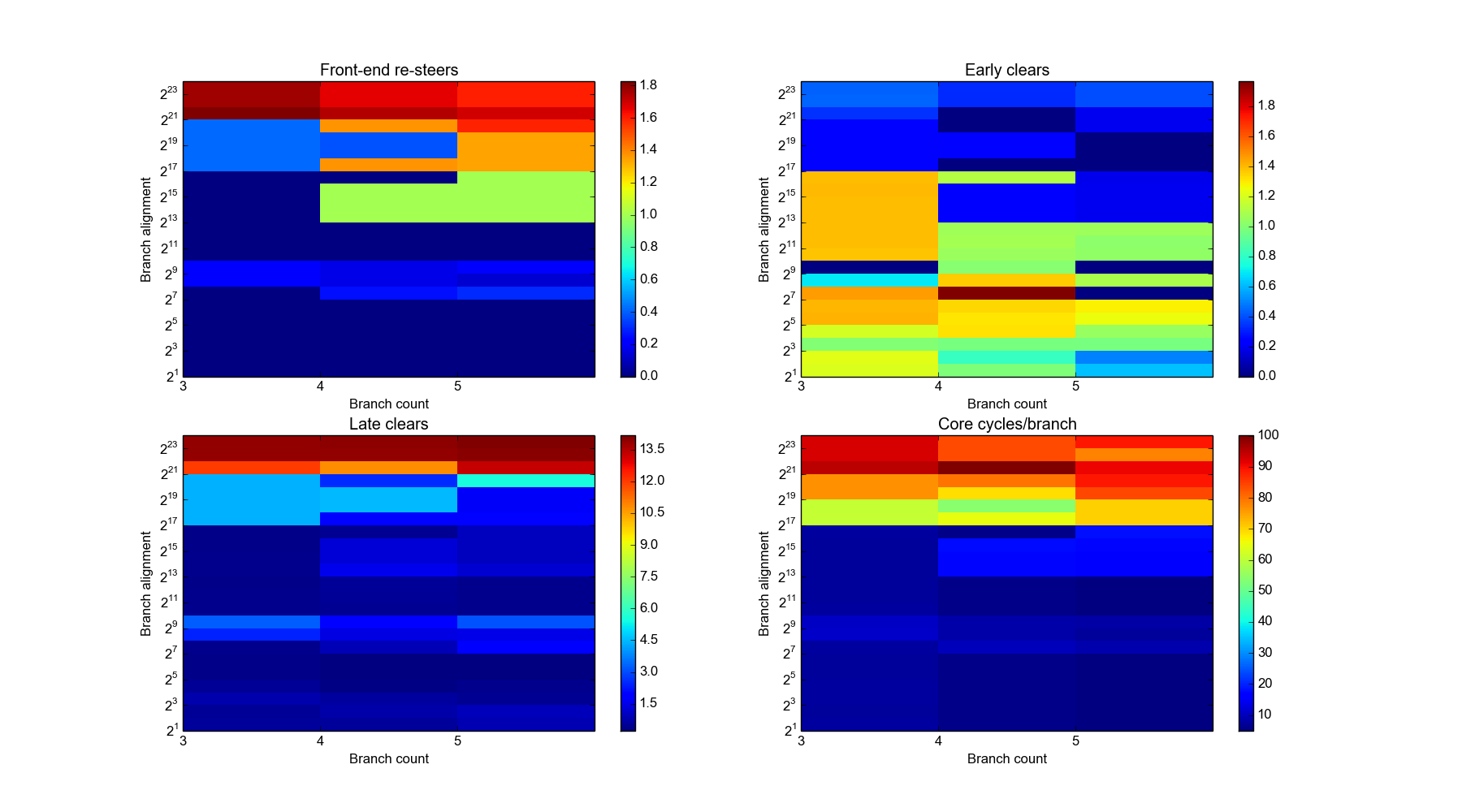 So, we suspect Haswell is using a different strategy to determine which set an address maps to. Let’s take a look at resteers for 3, 4 and 5 branches with a big D, to see if we can draw any conclusions: