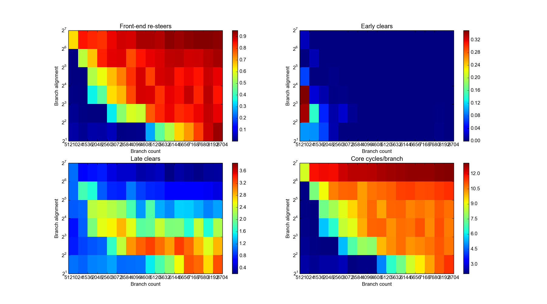 After last time’s analysis of the Arrendale BTB, I thought I should take a look at more contemporary CPUs. At work I have access to Haswell and Ivy Bridge machines. Before I got too far into interpretation, I spent a while making it as easy as possible to remotely run tests, and graph. The code has improved a little in this regard. For completeness, this article was written with the code at SHA hash ab8cbd1d.